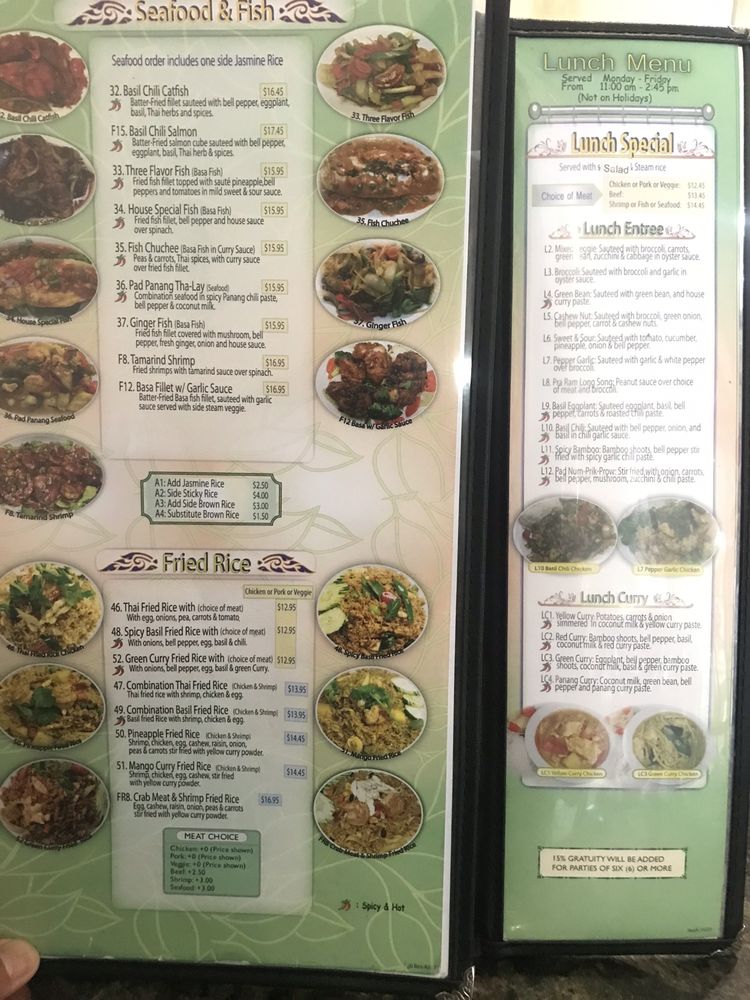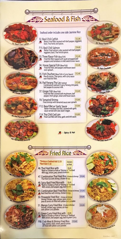 Peas & carrots, Thai spices with curry sauce over fried basa fish filet. Includes one side of jasmine rice.
